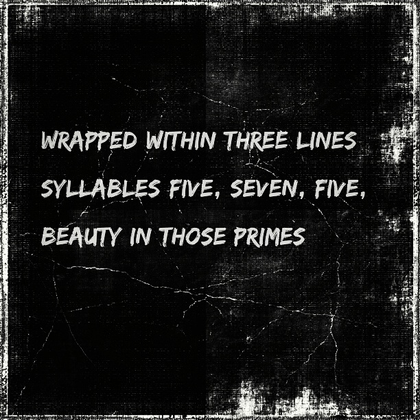 Prime Haiku Posted on March 11, 2016 by Carl Setzer Wrapped within three lines Syllables five, seven, five, Beauty in those primes Share this: Click to share on X (Opens in new window) X Click to share on Facebook (Opens in new window) Facebook Click to share on Tumblr (Opens in new window) Tumblr Click to share on Pinterest (Opens in new window) Pinterest Click to share on Reddit (Opens in new window) Reddit Like Loading... Related Published by Carl Setzer Writing haiku trying to figure out life View all posts by Carl Setzer