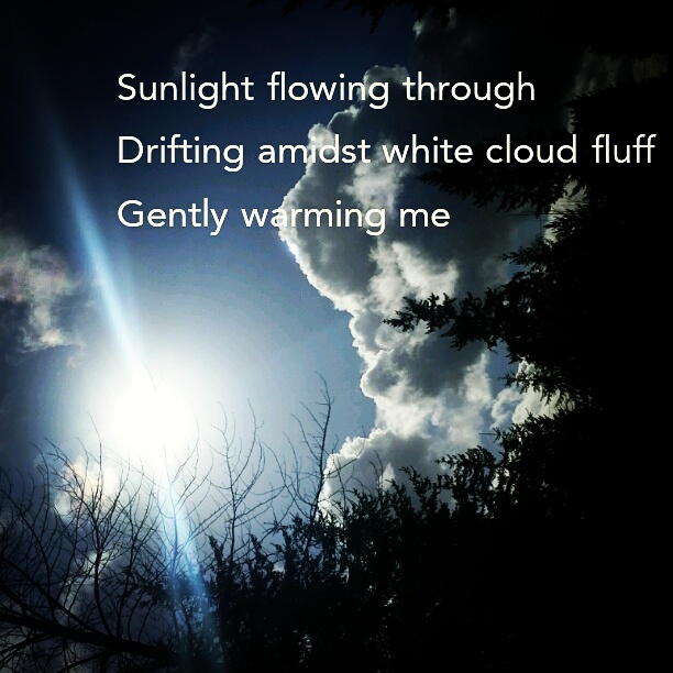 Amidst the Clouds Posted on March 26, 2016 by Carl Setzer Sunlight flowing through Drifting amidst white cloud fluff Gently warming me Share this: Click to share on X (Opens in new window) X Click to share on Facebook (Opens in new window) Facebook Click to share on Tumblr (Opens in new window) Tumblr Click to share on Pinterest (Opens in new window) Pinterest Click to share on Reddit (Opens in new window) Reddit Like Loading... Related Published by Carl Setzer Writing haiku trying to figure out life View all posts by Carl Setzer