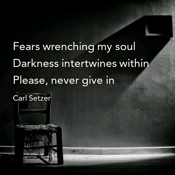 A meditation on fear Posted on May 8, 2016 by Carl Setzer Fears wrenching my soul Darkness intertwines within Please, never give in Share this: Click to share on X (Opens in new window) X Click to share on Facebook (Opens in new window) Facebook Click to share on Tumblr (Opens in new window) Tumblr Click to share on Pinterest (Opens in new window) Pinterest Click to share on Reddit (Opens in new window) Reddit Like Loading... Related Published by Carl Setzer Writing haiku trying to figure out life View all posts by Carl Setzer