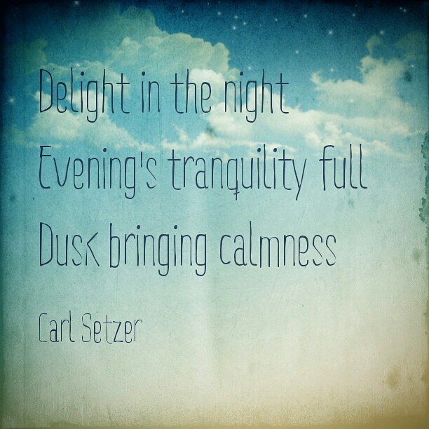 Tuesday Haiku Posted on June 7, 2016 by Carl Setzer Delight in the night Evening’s tranquility full Dusk bringing calmness Share this: Share on X (Opens in new window) X Share on Facebook (Opens in new window) Facebook Share on Tumblr (Opens in new window) Tumblr Share on Pinterest (Opens in new window) Pinterest Share on Reddit (Opens in new window) Reddit Like Loading... Related Published by Carl Setzer Writing haiku trying to figure out life View all posts by Carl Setzer