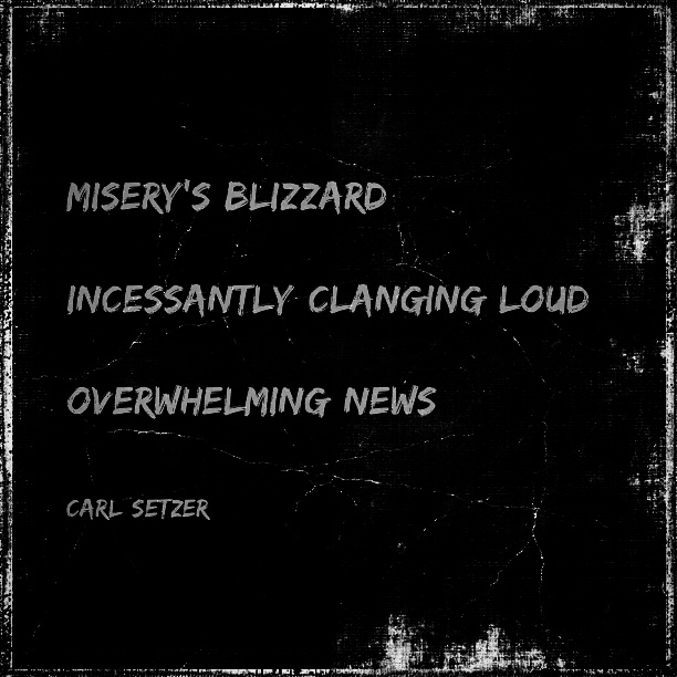 Too much news Posted on June 17, 2016 by Carl Setzer Misery’s blizzard Incessantly clanging loud Overwhelming news Share this: Click to share on X (Opens in new window) X Click to share on Facebook (Opens in new window) Facebook Click to share on Tumblr (Opens in new window) Tumblr Click to share on Pinterest (Opens in new window) Pinterest Click to share on Reddit (Opens in new window) Reddit Like Loading... Related Published by Carl Setzer Writing haiku trying to figure out life View all posts by Carl Setzer