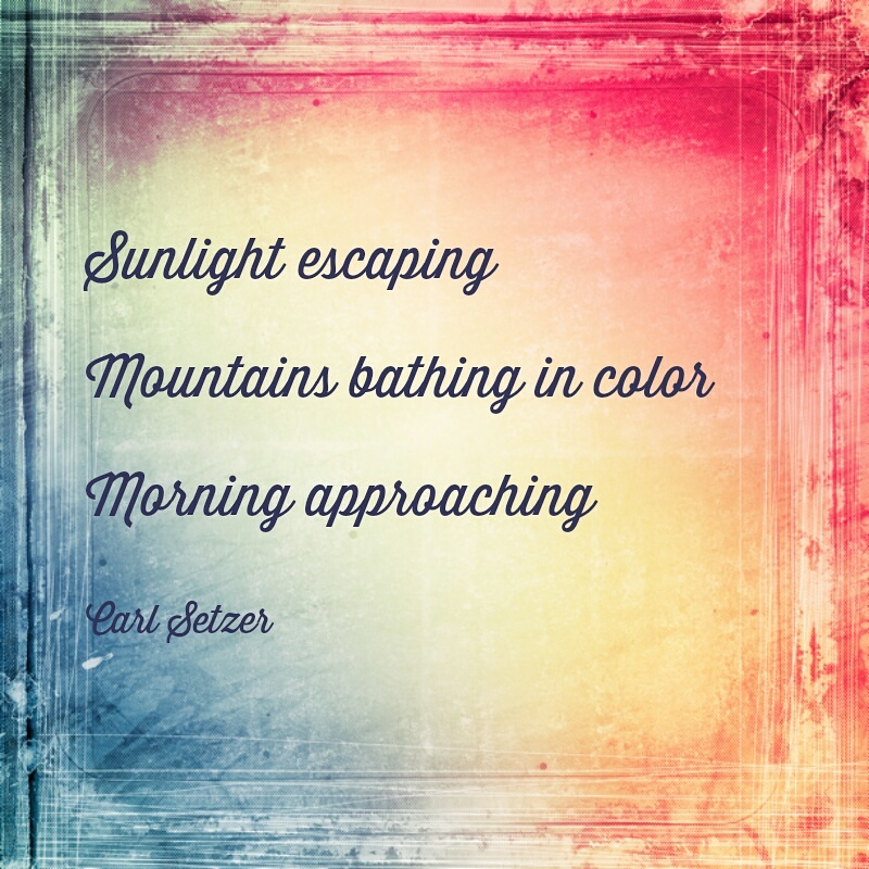 Saturday Sunday Posted on June 26, 2016 by Carl Setzer Sunlight escaping Mountains bathing in color Morning approaching May reach out you have a fantastic weekend Share this: Share on X (Opens in new window) X Share on Facebook (Opens in new window) Facebook Share on Tumblr (Opens in new window) Tumblr Share on Pinterest (Opens in new window) Pinterest Share on Reddit (Opens in new window) Reddit Like Loading... Related Published by Carl Setzer Writing haiku trying to figure out life View all posts by Carl Setzer