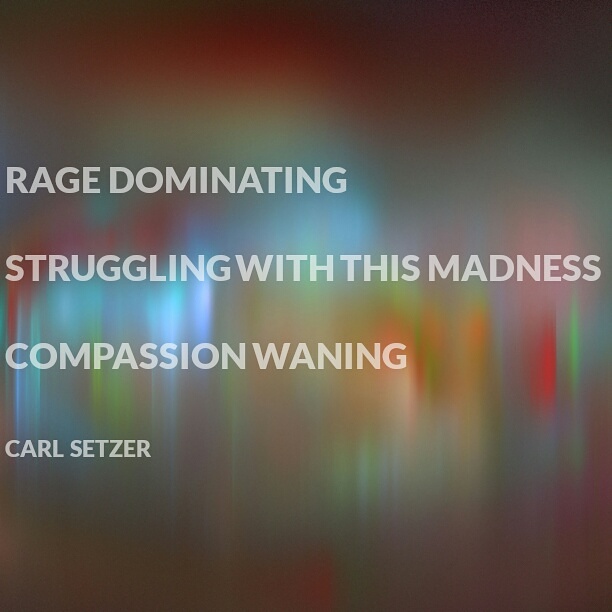 A Sunday night #haiku Posted on July 10, 2016 by Carl Setzer Rage dominating Struggling with this madness Compassion waning Share this: Click to share on X (Opens in new window) X Click to share on Facebook (Opens in new window) Facebook Click to share on Tumblr (Opens in new window) Tumblr Click to share on Pinterest (Opens in new window) Pinterest Click to share on Reddit (Opens in new window) Reddit Like Loading... Related Published by Carl Setzer Writing haiku trying to figure out life View all posts by Carl Setzer
