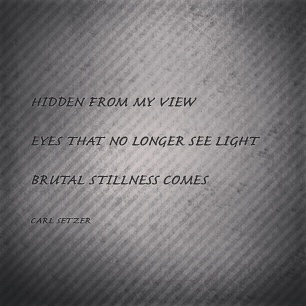 Eyes that do not see Posted on July 27, 2016August 19, 2016 by Carl Setzer Hidden from my view Eyes that no longer see light Brutal stillness comes Share this: Share on X (Opens in new window) X Share on Facebook (Opens in new window) Facebook Share on Tumblr (Opens in new window) Tumblr Share on Pinterest (Opens in new window) Pinterest Share on Reddit (Opens in new window) Reddit Like Loading... Related Published by Carl Setzer Writing haiku trying to figure out life View all posts by Carl Setzer