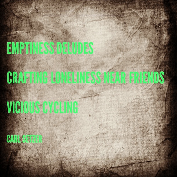 Emptiness Posted on September 1, 2016September 1, 2016 by Carl Setzer Emptiness deludes Crafting loneliness near friends Vicious cycling Share this: Click to share on X (Opens in new window) X Click to share on Facebook (Opens in new window) Facebook Click to share on Tumblr (Opens in new window) Tumblr Click to share on Pinterest (Opens in new window) Pinterest Click to share on Reddit (Opens in new window) Reddit Like Loading... Related Published by Carl Setzer Writing haiku trying to figure out life View all posts by Carl Setzer