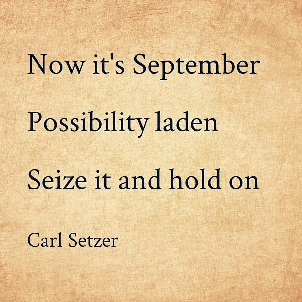 Welcome to September Posted on September 1, 2016 by Carl Setzer Now it’s September Possibility laden Seize it and hold on Share this: Click to share on X (Opens in new window) X Click to share on Facebook (Opens in new window) Facebook Click to share on Tumblr (Opens in new window) Tumblr Click to share on Pinterest (Opens in new window) Pinterest Click to share on Reddit (Opens in new window) Reddit Like Loading... Related Published by Carl Setzer Writing haiku trying to figure out life View all posts by Carl Setzer