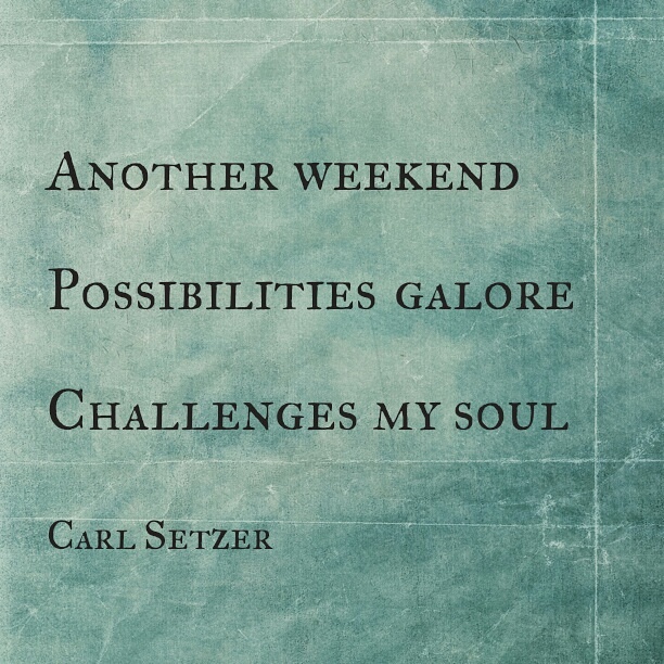 Welcoming the Weekend Posted on September 2, 2016 by Carl Setzer Another weekend Possibilities galore Challenges my soul Share this: Click to share on X (Opens in new window) X Click to share on Facebook (Opens in new window) Facebook Click to share on Tumblr (Opens in new window) Tumblr Click to share on Pinterest (Opens in new window) Pinterest Click to share on Reddit (Opens in new window) Reddit Like Loading... Related Published by Carl Setzer Writing haiku trying to figure out life View all posts by Carl Setzer