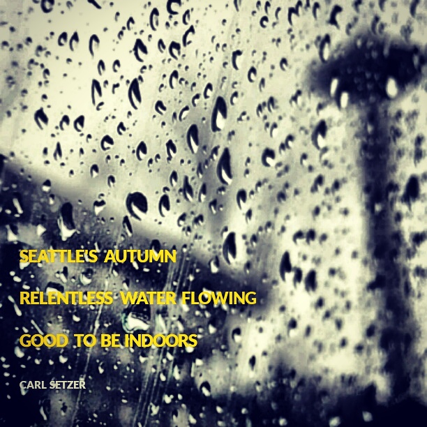 Seattle’s autumn Posted on November 6, 2016 by Carl Setzer Seattle’s autumn Relentless water flowing Good to be indoors Share this: Click to share on X (Opens in new window) X Click to share on Facebook (Opens in new window) Facebook Click to share on Tumblr (Opens in new window) Tumblr Click to share on Pinterest (Opens in new window) Pinterest Click to share on Reddit (Opens in new window) Reddit Like Loading... Related Published by Carl Setzer Writing haiku trying to figure out life View all posts by Carl Setzer