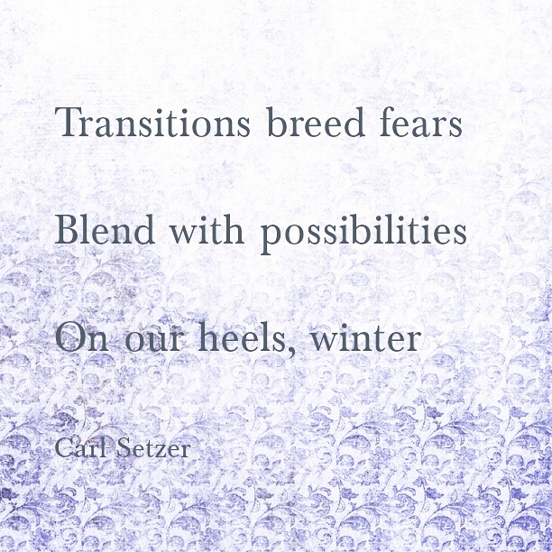 Transitions Posted on November 22, 2016 by Carl Setzer Transitions breed fears Blend with possibilities On our heels, winter Share this: Click to share on X (Opens in new window) X Click to share on Facebook (Opens in new window) Facebook Click to share on Tumblr (Opens in new window) Tumblr Click to share on Pinterest (Opens in new window) Pinterest Click to share on Reddit (Opens in new window) Reddit Like Loading... Related Published by Carl Setzer Writing haiku trying to figure out life View all posts by Carl Setzer