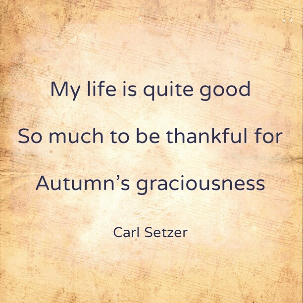 Happy Thanksgiving! Posted on November 24, 2016 by Carl Setzer My life is quite good So much to be thankful for Autumn’s graciousness Share this: Share on X (Opens in new window) X Share on Facebook (Opens in new window) Facebook Share on Tumblr (Opens in new window) Tumblr Share on Pinterest (Opens in new window) Pinterest Share on Reddit (Opens in new window) Reddit Like Loading... Related Published by Carl Setzer Writing haiku trying to figure out life View all posts by Carl Setzer