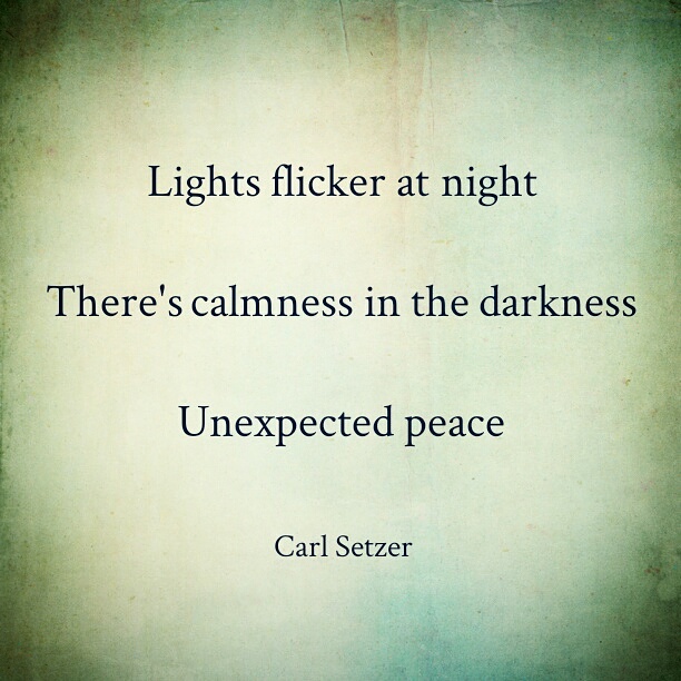 Calmness in the Darkness Posted on November 28, 2016 by Carl Setzer Lights flicker at night There’s calmness in the darkness Unexpected peace Share this: Click to share on X (Opens in new window) X Click to share on Facebook (Opens in new window) Facebook Click to share on Tumblr (Opens in new window) Tumblr Click to share on Pinterest (Opens in new window) Pinterest Click to share on Reddit (Opens in new window) Reddit Like Loading... Related Published by Carl Setzer Writing haiku trying to figure out life View all posts by Carl Setzer