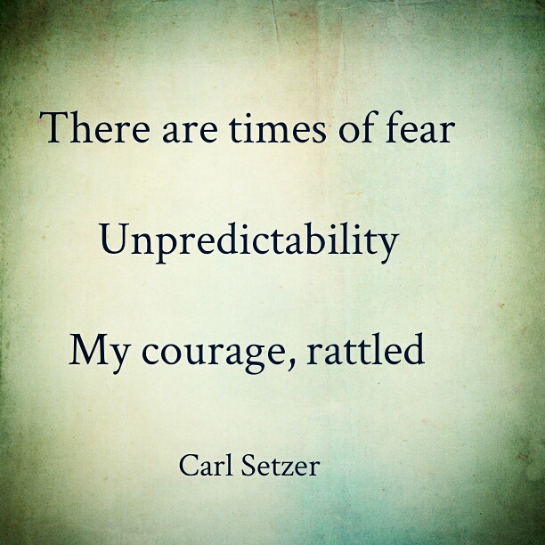 Looking at Fear Posted on December 1, 2016 by Carl Setzer There are times of fear Unpredictability My courage, rattled Share this: Click to share on X (Opens in new window) X Click to share on Facebook (Opens in new window) Facebook Click to share on Tumblr (Opens in new window) Tumblr Click to share on Pinterest (Opens in new window) Pinterest Click to share on Reddit (Opens in new window) Reddit Like Loading... Related Published by Carl Setzer Writing haiku trying to figure out life View all posts by Carl Setzer