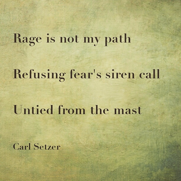 Posted on December 6, 2016 by Carl Setzer Rage is not my path Refusing fear’s siren call Untied from the mast Share this: Click to share on X (Opens in new window) X Click to share on Facebook (Opens in new window) Facebook Click to share on Tumblr (Opens in new window) Tumblr Click to share on Pinterest (Opens in new window) Pinterest Click to share on Reddit (Opens in new window) Reddit Like Loading... Related Published by Carl Setzer Writing haiku trying to figure out life View all posts by Carl Setzer