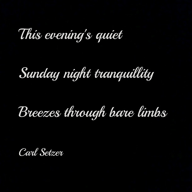 Posted on December 11, 2016 by Carl Setzer This evening’s quiet Sunday night tranquillity Breezes through bare limbs Share this: Click to share on X (Opens in new window) X Click to share on Facebook (Opens in new window) Facebook Click to share on Tumblr (Opens in new window) Tumblr Click to share on Pinterest (Opens in new window) Pinterest Click to share on Reddit (Opens in new window) Reddit Like Loading... Related Published by Carl Setzer Writing haiku trying to figure out life View all posts by Carl Setzer