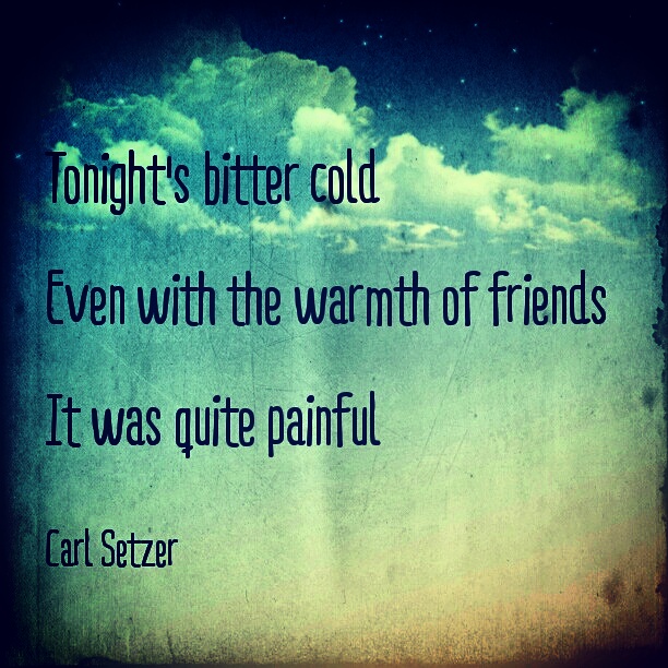 Tonight’s Bitter Cold Posted on December 13, 2016 by Carl Setzer Tonight’s bitter cold Even with the warmth of friends It was quite painful Share this: Click to share on X (Opens in new window) X Click to share on Facebook (Opens in new window) Facebook Click to share on Tumblr (Opens in new window) Tumblr Click to share on Pinterest (Opens in new window) Pinterest Click to share on Reddit (Opens in new window) Reddit Like Loading... Related Published by Carl Setzer Writing haiku trying to figure out life View all posts by Carl Setzer