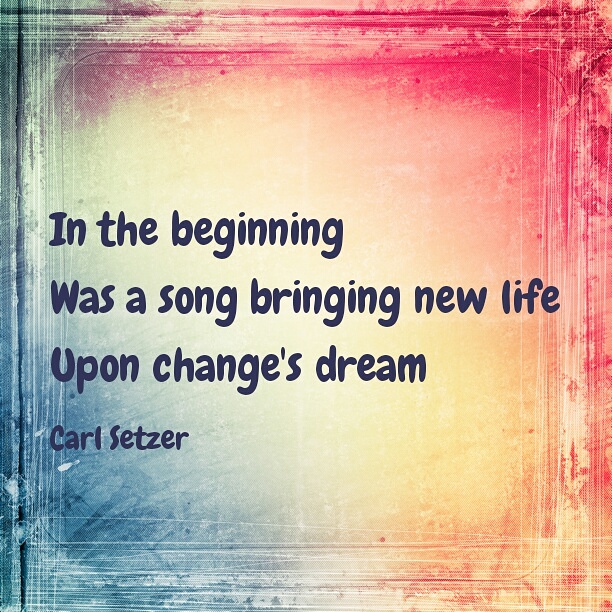 The beginning Posted on December 23, 2016 by Carl Setzer In the beginning Was a song bringing new life Upon change’s dream Share this: Click to share on X (Opens in new window) X Click to share on Facebook (Opens in new window) Facebook Click to share on Tumblr (Opens in new window) Tumblr Click to share on Pinterest (Opens in new window) Pinterest Click to share on Reddit (Opens in new window) Reddit Like Loading... Related Published by Carl Setzer Writing haiku trying to figure out life View all posts by Carl Setzer