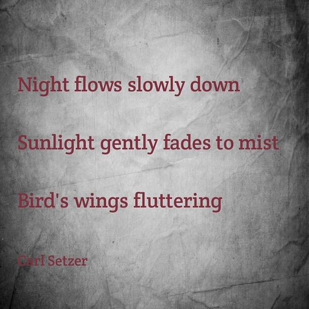 Night Comes Posted on December 28, 2016 by Carl Setzer Night flows slowly down Sunlight gently fades to mist Bird’s wings fluttering Share this: Click to share on X (Opens in new window) X Click to share on Facebook (Opens in new window) Facebook Click to share on Tumblr (Opens in new window) Tumblr Click to share on Pinterest (Opens in new window) Pinterest Click to share on Reddit (Opens in new window) Reddit Like Loading... Related Published by Carl Setzer Writing haiku trying to figure out life View all posts by Carl Setzer