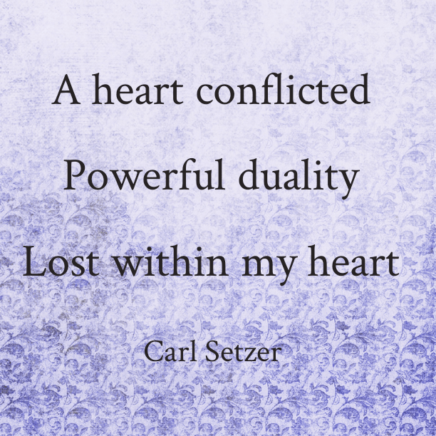 Duality Posted on January 27, 2017 by Carl Setzer A heart conflicted Powerful duality Lost within my heart Share this: Click to share on X (Opens in new window) X Click to share on Facebook (Opens in new window) Facebook Click to share on Tumblr (Opens in new window) Tumblr Click to share on Pinterest (Opens in new window) Pinterest Click to share on Reddit (Opens in new window) Reddit Like Loading... Related Published by Carl Setzer Writing haiku trying to figure out life View all posts by Carl Setzer