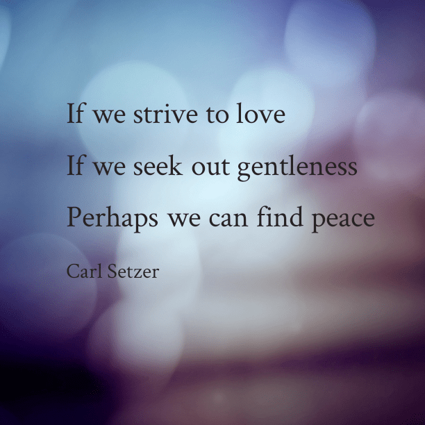 Seeking Peace Posted on February 15, 2017 by Carl Setzer If we strive to love If we seek out gentleness Perhaps we can find peace Share this: Click to share on X (Opens in new window) X Click to share on Facebook (Opens in new window) Facebook Click to share on Tumblr (Opens in new window) Tumblr Click to share on Pinterest (Opens in new window) Pinterest Click to share on Reddit (Opens in new window) Reddit Like Loading... Related Published by Carl Setzer Writing haiku trying to figure out life View all posts by Carl Setzer