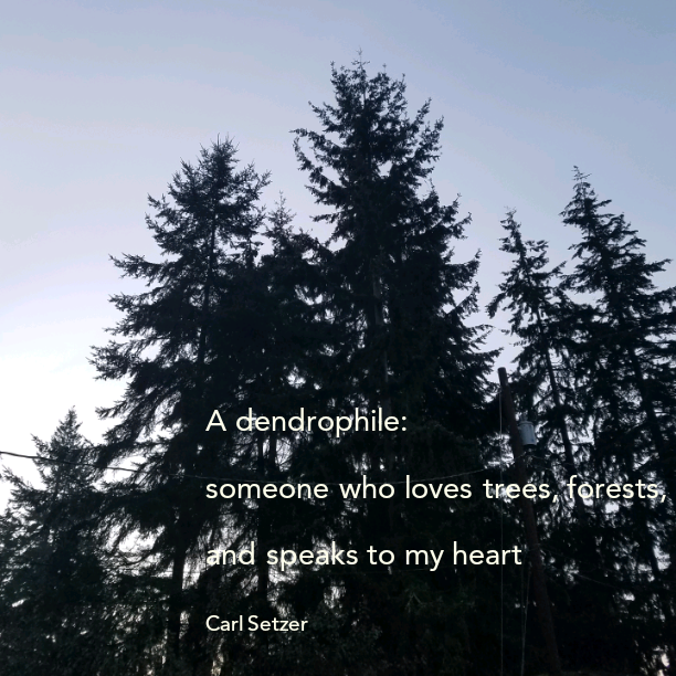A Dendrophile Posted on April 10, 2017 by Carl Setzer A dendrophile: someone who loves trees, forests, and speaks to my heart Share this: Click to share on X (Opens in new window) X Click to share on Facebook (Opens in new window) Facebook Click to share on Tumblr (Opens in new window) Tumblr Click to share on Pinterest (Opens in new window) Pinterest Click to share on Reddit (Opens in new window) Reddit Like Loading... Related Published by Carl Setzer Writing haiku trying to figure out life View all posts by Carl Setzer