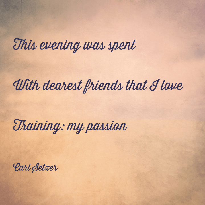 An evening, training Posted on June 21, 2017 by Carl Setzer This evening was spent With dearest friends that I love Training: my passion Share this: Click to share on X (Opens in new window) X Click to share on Facebook (Opens in new window) Facebook Click to share on Tumblr (Opens in new window) Tumblr Click to share on Pinterest (Opens in new window) Pinterest Click to share on Reddit (Opens in new window) Reddit Like Loading... Related Published by Carl Setzer Writing haiku trying to figure out life View all posts by Carl Setzer