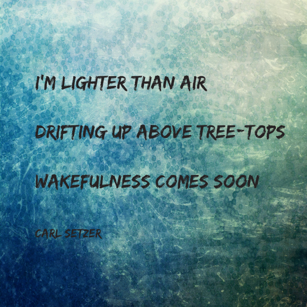 Lighter Than Air Posted on July 1, 2017 by Carl Setzer I’m lighter than air Drifting up above tree-tops Wakefulness comes soon Share this: Click to share on X (Opens in new window) X Click to share on Facebook (Opens in new window) Facebook Click to share on Tumblr (Opens in new window) Tumblr Click to share on Pinterest (Opens in new window) Pinterest Click to share on Reddit (Opens in new window) Reddit Like Loading... Related Published by Carl Setzer Writing haiku trying to figure out life View all posts by Carl Setzer