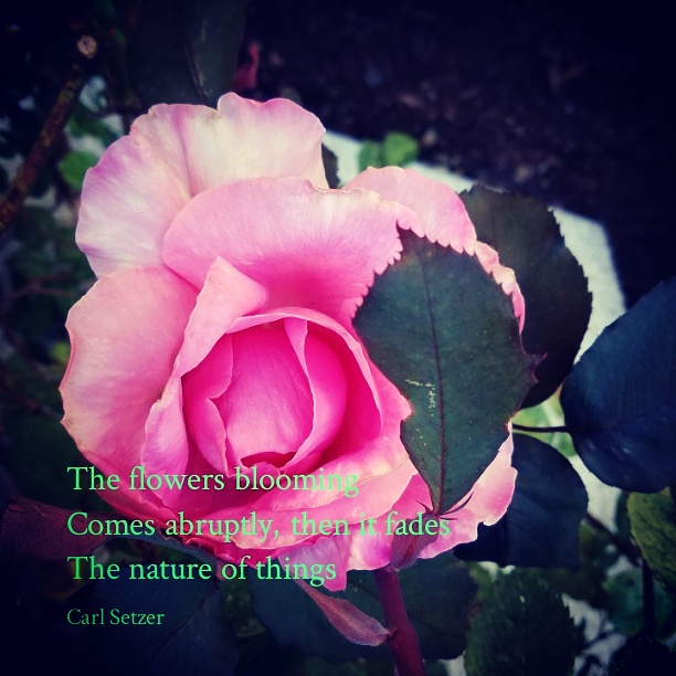 The Nature Of Things Posted on July 4, 2017July 4, 2017 by Carl Setzer The flowers blooming Comes abruptly, then it fades The nature of things Came across this rose while walking this afternoon. I hadn’t noticed it before, and the petals will be on the ground shortly. Share this: Click to share on X (Opens in new window) X Click to share on Facebook (Opens in new window) Facebook Click to share on Tumblr (Opens in new window) Tumblr Click to share on Pinterest (Opens in new window) Pinterest Click to share on Reddit (Opens in new window) Reddit Like Loading... Related Published by Carl Setzer Writing haiku trying to figure out life View all posts by Carl Setzer