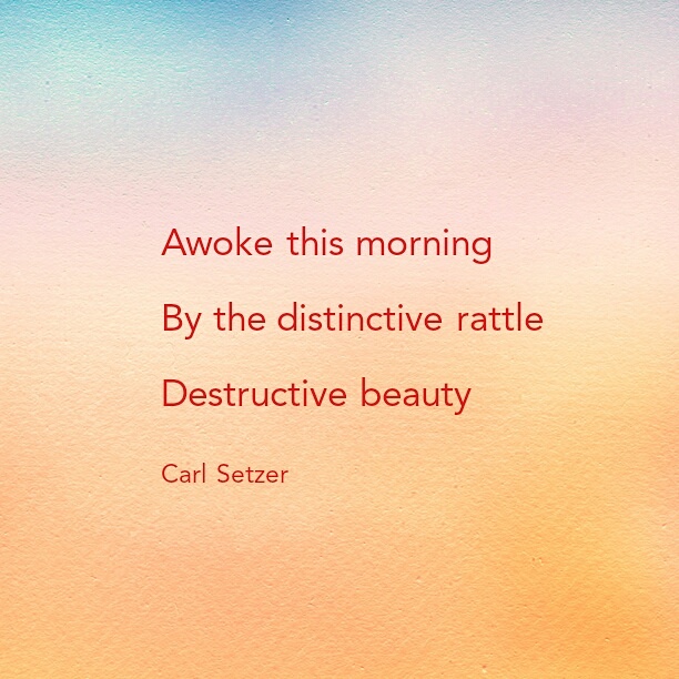 The Flicker Posted on July 6, 2017July 6, 2017 by Carl Setzer Awoke this morning By the distinctive rattle Destructive beauty Woke to the rattle of a woodpecker on my roof. It took several tosses of fir cones, but he was convinced to move along. Share this: Click to share on X (Opens in new window) X Click to share on Facebook (Opens in new window) Facebook Click to share on Tumblr (Opens in new window) Tumblr Click to share on Pinterest (Opens in new window) Pinterest Click to share on Reddit (Opens in new window) Reddit Like Loading... Related Published by Carl Setzer Writing haiku trying to figure out life View all posts by Carl Setzer