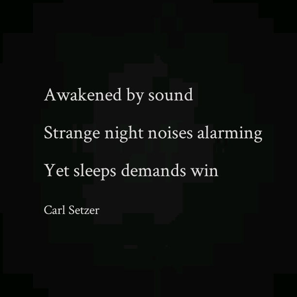 Why I’m Awake At 3:00 AM Posted on August 17, 2017 by Carl Setzer Awakened by sound Strange night noises alarming Yet sleeps demands win Share this: Click to share on X (Opens in new window) X Click to share on Facebook (Opens in new window) Facebook Click to share on Tumblr (Opens in new window) Tumblr Click to share on Pinterest (Opens in new window) Pinterest Click to share on Reddit (Opens in new window) Reddit Like Loading... Related Published by Carl Setzer Writing haiku trying to figure out life View all posts by Carl Setzer