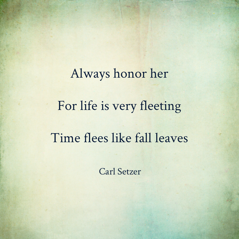 A Haiku About Mothers Posted on September 12, 2017September 13, 2017 by Carl Setzer Always honor her For life is very fleeting Time flees like fall leaves I think about my mother often. My mother died when she was forty. Weird to have outlived her. Share this: Click to share on X (Opens in new window) X Click to share on Facebook (Opens in new window) Facebook Click to share on Tumblr (Opens in new window) Tumblr Click to share on Pinterest (Opens in new window) Pinterest Click to share on Reddit (Opens in new window) Reddit Like Loading... Related Published by Carl Setzer Writing haiku trying to figure out life View all posts by Carl Setzer