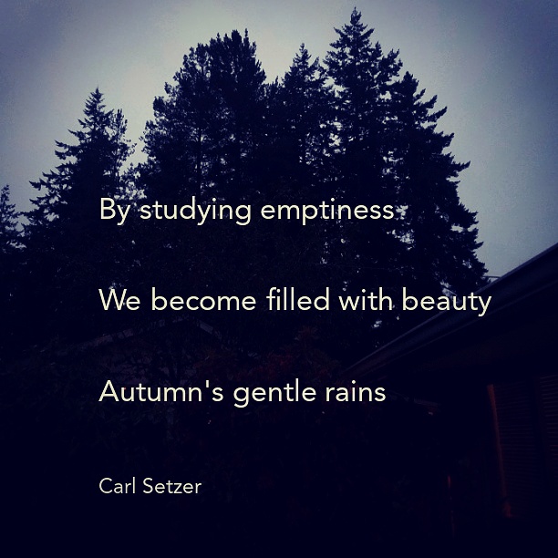 Posted on September 17, 2017 by Carl Setzer By studying emptiness We become filled with beauty Autumn’s gentle rains Share this: Click to share on X (Opens in new window) X Click to share on Facebook (Opens in new window) Facebook Click to share on Tumblr (Opens in new window) Tumblr Click to share on Pinterest (Opens in new window) Pinterest Click to share on Reddit (Opens in new window) Reddit Like Loading... Related Published by Carl Setzer Writing haiku trying to figure out life View all posts by Carl Setzer