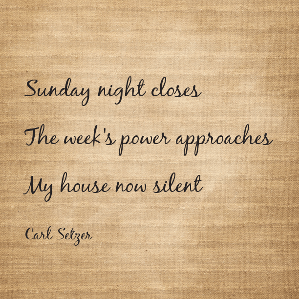 Sunday Night Posted on October 8, 2017 by Carl Setzer Sunday night closes The week’s power approaches My house now silent Share this: Click to share on X (Opens in new window) X Click to share on Facebook (Opens in new window) Facebook Click to share on Tumblr (Opens in new window) Tumblr Click to share on Pinterest (Opens in new window) Pinterest Click to share on Reddit (Opens in new window) Reddit Like Loading... Related Published by Carl Setzer Writing haiku trying to figure out life View all posts by Carl Setzer