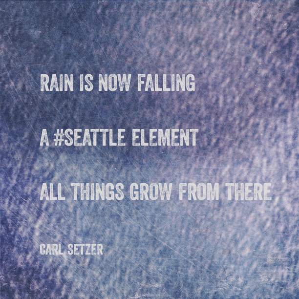 A Rainy Seattle Friday: Haiku Challenge Posted on November 3, 2017 by Carl Setzer Rain is now falling A #Seattle element All things grow from there The “word of the day” was “element” Share this: Click to share on X (Opens in new window) X Click to share on Facebook (Opens in new window) Facebook Click to share on Tumblr (Opens in new window) Tumblr Click to share on Pinterest (Opens in new window) Pinterest Click to share on Reddit (Opens in new window) Reddit Like Loading... Related Published by Carl Setzer Writing haiku trying to figure out life View all posts by Carl Setzer