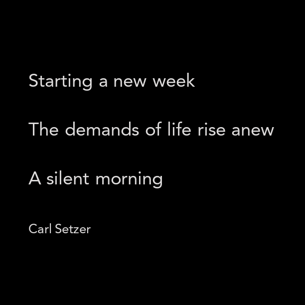Another Monday Posted on January 29, 2018 by Carl Setzer Starting a new week The demands of life rise anew A silent morning Share this: Click to share on X (Opens in new window) X Click to share on Facebook (Opens in new window) Facebook Click to share on Tumblr (Opens in new window) Tumblr Click to share on Pinterest (Opens in new window) Pinterest Click to share on Reddit (Opens in new window) Reddit Like Loading... Related Published by Carl Setzer Writing haiku trying to figure out life View all posts by Carl Setzer