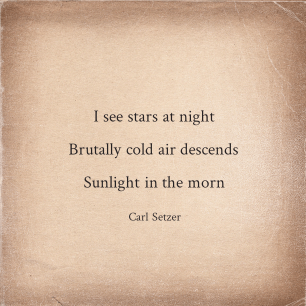A starry, winter’s night Posted on February 11, 2018 by Carl Setzer I see stars at night Brutally cold air descends Sunlight in the morn Share this: Click to share on X (Opens in new window) X Click to share on Facebook (Opens in new window) Facebook Click to share on Tumblr (Opens in new window) Tumblr Click to share on Pinterest (Opens in new window) Pinterest Click to share on Reddit (Opens in new window) Reddit Like Loading... Related Published by Carl Setzer Writing haiku trying to figure out life View all posts by Carl Setzer