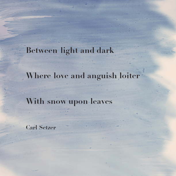 Between Light and Dark Posted on February 21, 2018 by Carl Setzer Between light and dark Where love and anguish loiter With snow upon leaves Share this: Click to share on X (Opens in new window) X Click to share on Facebook (Opens in new window) Facebook Click to share on Tumblr (Opens in new window) Tumblr Click to share on Pinterest (Opens in new window) Pinterest Click to share on Reddit (Opens in new window) Reddit Like Loading... Related Published by Carl Setzer Writing haiku trying to figure out life View all posts by Carl Setzer
