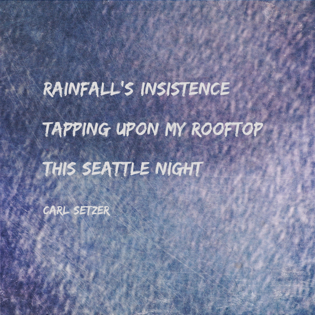This Seattle Night, A Haiku Posted on March 7, 2018 by Carl Setzer Rainfall’s insistence Tapping upon my rooftop This Seattle night Share this: Click to share on X (Opens in new window) X Click to share on Facebook (Opens in new window) Facebook Click to share on Tumblr (Opens in new window) Tumblr Click to share on Pinterest (Opens in new window) Pinterest Click to share on Reddit (Opens in new window) Reddit Like Loading... Related Published by Carl Setzer Writing haiku trying to figure out life View all posts by Carl Setzer