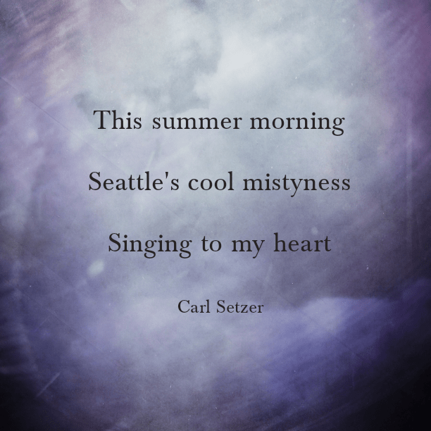 This summer morning haiku Posted on July 1, 2018 by Carl Setzer This summer morning Seattle’s cool mistyness Singing to my heart Something about Seattle’s misty mornings speak to my soul. Share this: Click to share on X (Opens in new window) X Click to share on Facebook (Opens in new window) Facebook Click to share on Tumblr (Opens in new window) Tumblr Click to share on Pinterest (Opens in new window) Pinterest Click to share on Reddit (Opens in new window) Reddit Like Loading... Related Published by Carl Setzer Writing haiku trying to figure out life View all posts by Carl Setzer