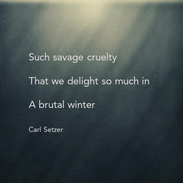 Our Delight In Cruelty Posted on October 8, 2018October 8, 2018 by Carl Setzer A Haiku against cruelty Such savage cruelty That we delight so much in A brutal winter In this age we distain grace and compassion, claiming it weak. Share this: Click to share on X (Opens in new window) X Click to share on Facebook (Opens in new window) Facebook Click to share on Tumblr (Opens in new window) Tumblr Click to share on Pinterest (Opens in new window) Pinterest Click to share on Reddit (Opens in new window) Reddit Like Loading... Related Published by Carl Setzer Writing haiku trying to figure out life View all posts by Carl Setzer