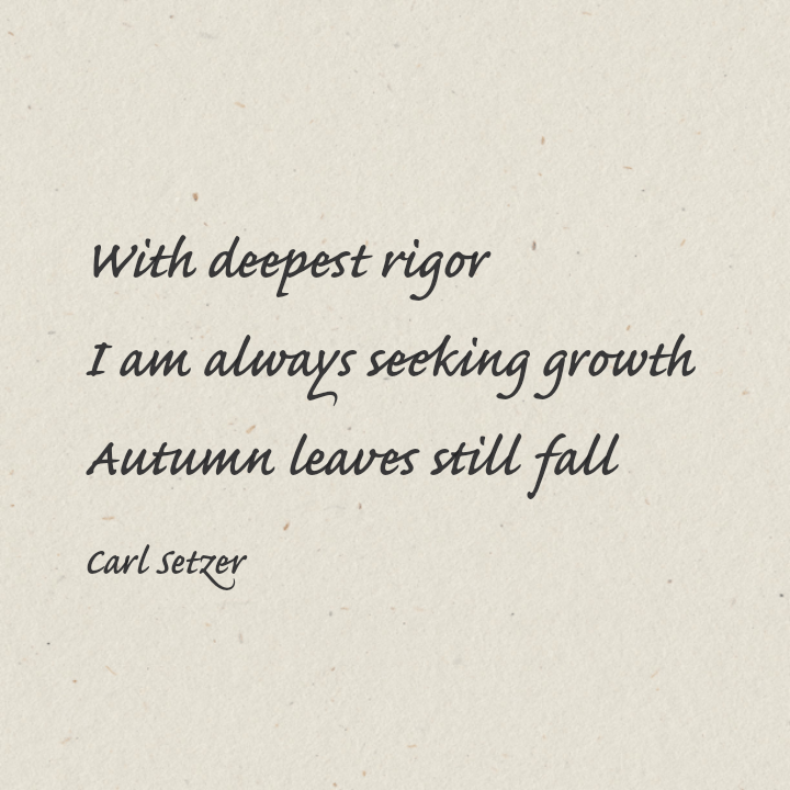 Seeking Growth Posted on October 28, 2018 by Carl Setzer With deepest rigor I am always seeking growth Autumn leaves still fall Share this: Click to share on X (Opens in new window) X Click to share on Facebook (Opens in new window) Facebook Click to share on Tumblr (Opens in new window) Tumblr Click to share on Pinterest (Opens in new window) Pinterest Click to share on Reddit (Opens in new window) Reddit Like Loading... Related Published by Carl Setzer Writing haiku trying to figure out life View all posts by Carl Setzer