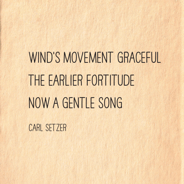 A Wind Transformed: A Haiku Posted on November 3, 2018 by Carl Setzer Wind’s movement graceful The earlier fortitude Now a gentle song Share this: Click to share on X (Opens in new window) X Click to share on Facebook (Opens in new window) Facebook Click to share on Tumblr (Opens in new window) Tumblr Click to share on Pinterest (Opens in new window) Pinterest Click to share on Reddit (Opens in new window) Reddit Like Loading... Related Published by Carl Setzer Writing haiku trying to figure out life View all posts by Carl Setzer