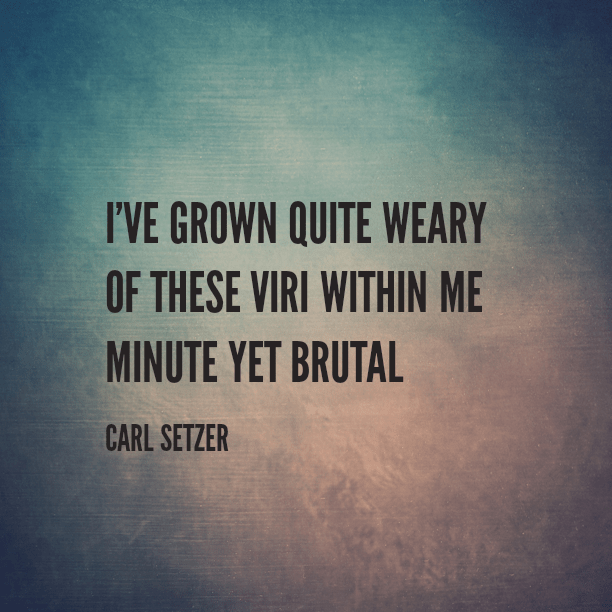 Dastardly Viri Posted on February 22, 2019 by Carl Setzer I’ve grown quite weary Of these viri within me Minute yet brutal Share this: Click to share on X (Opens in new window) X Click to share on Facebook (Opens in new window) Facebook Click to share on Tumblr (Opens in new window) Tumblr Click to share on Pinterest (Opens in new window) Pinterest Click to share on Reddit (Opens in new window) Reddit Like Loading... Related Published by Carl Setzer Writing haiku trying to figure out life View all posts by Carl Setzer