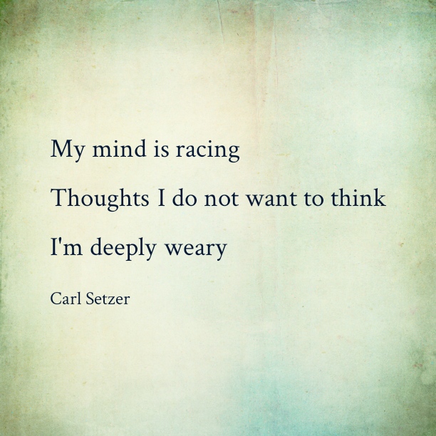 Thoughts I do not want to think Posted on March 9, 2019 by Carl Setzer My mind is racing Thoughts I do not want to think I’m deeply weary Share this: Click to share on X (Opens in new window) X Click to share on Facebook (Opens in new window) Facebook Click to share on Tumblr (Opens in new window) Tumblr Click to share on Pinterest (Opens in new window) Pinterest Click to share on Reddit (Opens in new window) Reddit Like Loading... Related Published by Carl Setzer Writing haiku trying to figure out life View all posts by Carl Setzer
