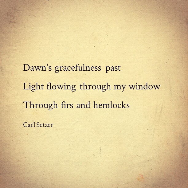 Today’s Haiku, May 8, 2019 Posted on May 8, 2019 by Carl Setzer Dawn’s gracefulness past Light flowing through my window Through firs and hemlocks Share this: Click to share on X (Opens in new window) X Click to share on Facebook (Opens in new window) Facebook Click to share on Tumblr (Opens in new window) Tumblr Click to share on Pinterest (Opens in new window) Pinterest Click to share on Reddit (Opens in new window) Reddit Like Loading... Related Published by Carl Setzer Writing haiku trying to figure out life View all posts by Carl Setzer