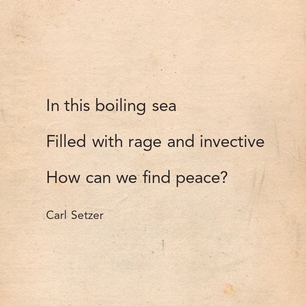Rage and Invective: A Haiku Posted on August 5, 2019 by Carl Setzer In this boiling sea Filled with rage and invective How can we find peace? Share this: Click to share on X (Opens in new window) X Click to share on Facebook (Opens in new window) Facebook Click to share on Tumblr (Opens in new window) Tumblr Click to share on Pinterest (Opens in new window) Pinterest Click to share on Reddit (Opens in new window) Reddit Like Loading... Related Published by Carl Setzer Writing haiku trying to figure out life View all posts by Carl Setzer