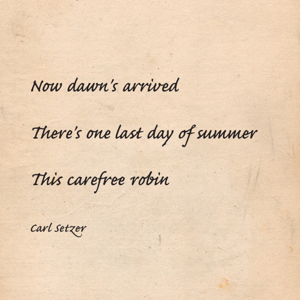 The Last Days Of Summer Posted on September 2, 2019 by Carl Setzer Now dawn’s arrived There’s one last day of summer This carefree robin Share this: Click to share on X (Opens in new window) X Click to share on Facebook (Opens in new window) Facebook Click to share on Tumblr (Opens in new window) Tumblr Click to share on Pinterest (Opens in new window) Pinterest Click to share on Reddit (Opens in new window) Reddit Like Loading... Related Published by Carl Setzer Writing haiku trying to figure out life View all posts by Carl Setzer
