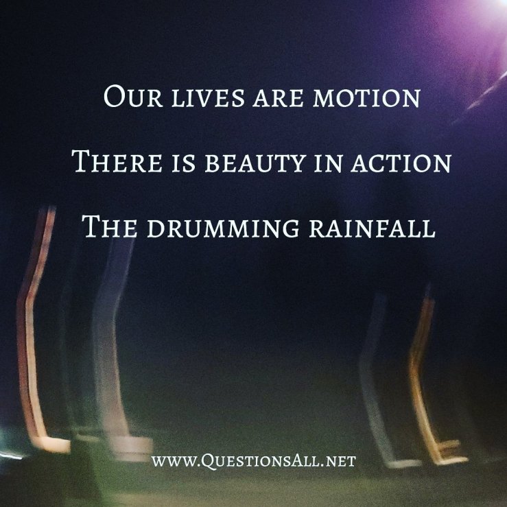 Beauty in Action: Tonight’s Haiku Posted on October 17, 2019 by Carl Setzer Our lives are motion There is beauty in action The drumming rainfall Wishing you a restful night. Share this: Click to share on X (Opens in new window) X Click to share on Facebook (Opens in new window) Facebook Click to share on Tumblr (Opens in new window) Tumblr Click to share on Pinterest (Opens in new window) Pinterest Click to share on Reddit (Opens in new window) Reddit Like Loading... Related Published by Carl Setzer Writing haiku trying to figure out life View all posts by Carl Setzer