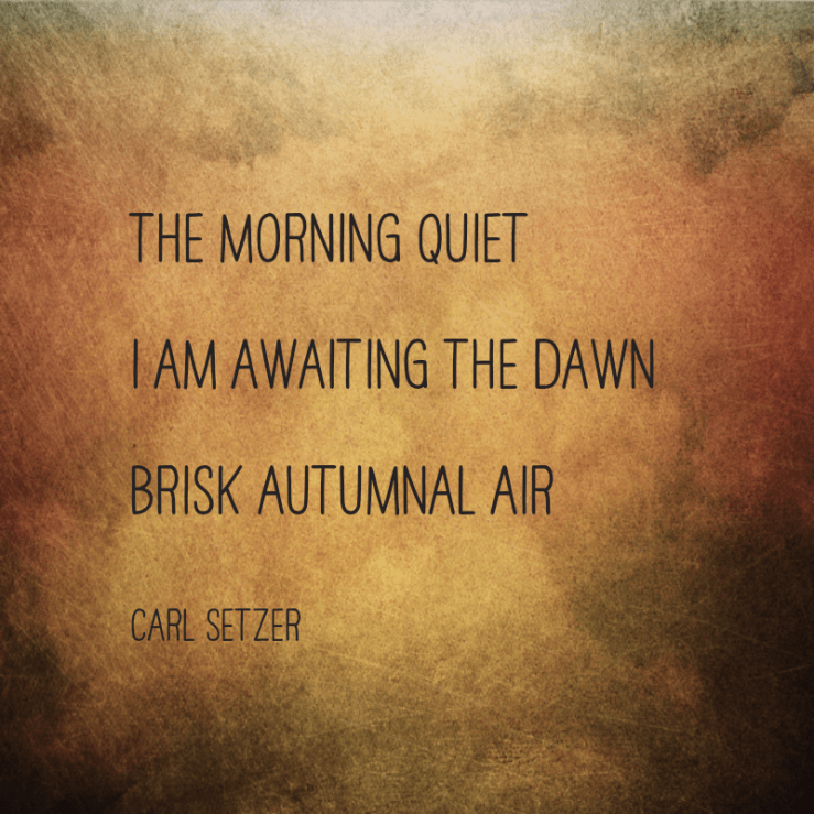 Morning Haiku, October 27, 2019 Posted on October 27, 2019 by Carl Setzer The morning quiet I am awaiting the dawn Brisk autumnal air Here in Seattle autumn’s fully present. Leaves blow around. Rake’s efforts needed. The time for sweaters, jackets and scarves arrived. A happy time for me. Share this: Click to share on X (Opens in new window) X Click to share on Facebook (Opens in new window) Facebook Click to share on Tumblr (Opens in new window) Tumblr Click to share on Pinterest (Opens in new window) Pinterest Click to share on Reddit (Opens in new window) Reddit Like Loading... Related Published by Carl Setzer Writing haiku trying to figure out life View all posts by Carl Setzer