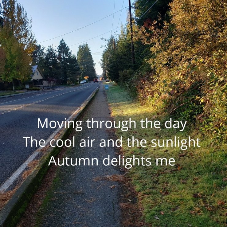 Tonight’s Haiku: October 27, 2019 Posted on October 27, 2019 by Carl Setzer Moving through the day The cool air and the sunlight Autumn delights me Share this: Click to share on X (Opens in new window) X Click to share on Facebook (Opens in new window) Facebook Click to share on Tumblr (Opens in new window) Tumblr Click to share on Pinterest (Opens in new window) Pinterest Click to share on Reddit (Opens in new window) Reddit Like Loading... Related Published by Carl Setzer Writing haiku trying to figure out life View all posts by Carl Setzer