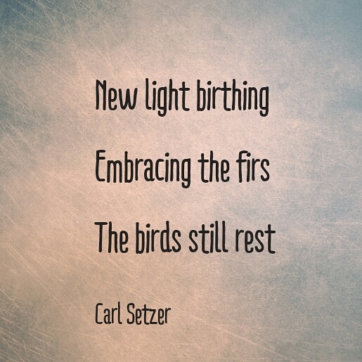 Monday Morning, November 4 Posted on November 4, 2019 by Carl Setzer New light birthing Embracing the firs The birds still rest Share this: Click to share on X (Opens in new window) X Click to share on Facebook (Opens in new window) Facebook Click to share on Tumblr (Opens in new window) Tumblr Click to share on Pinterest (Opens in new window) Pinterest Click to share on Reddit (Opens in new window) Reddit Like Loading... Related Published by Carl Setzer Writing haiku trying to figure out life View all posts by Carl Setzer